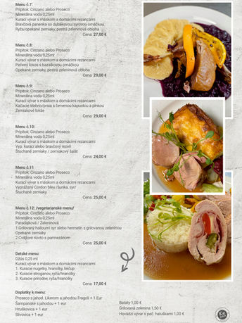 Pozývame Vás vychutnať si jedinečný kulinársky zážitok s naším slávnostným menu, ktoré je ideálne na všetky príležitosti, či už je to svadba, jubileum alebo rodinná oslava. Naše menu je starostlivo zostavené z najkvalitnejších surovín, aby sme Vám priniesli nezabudnuteľný zážitok plný chutí a vôní.